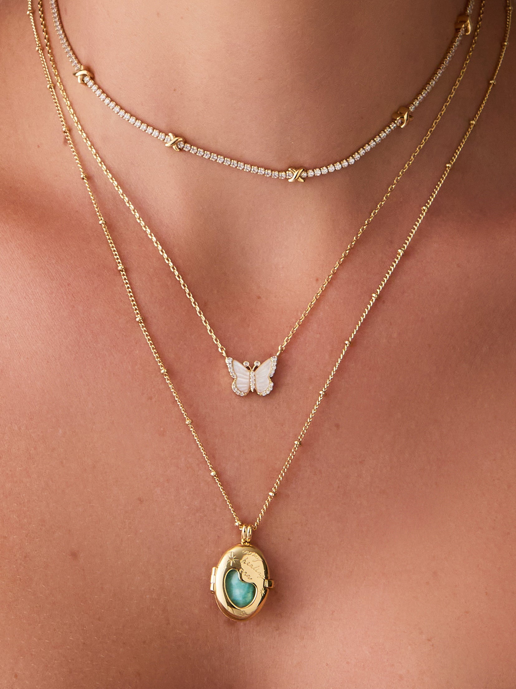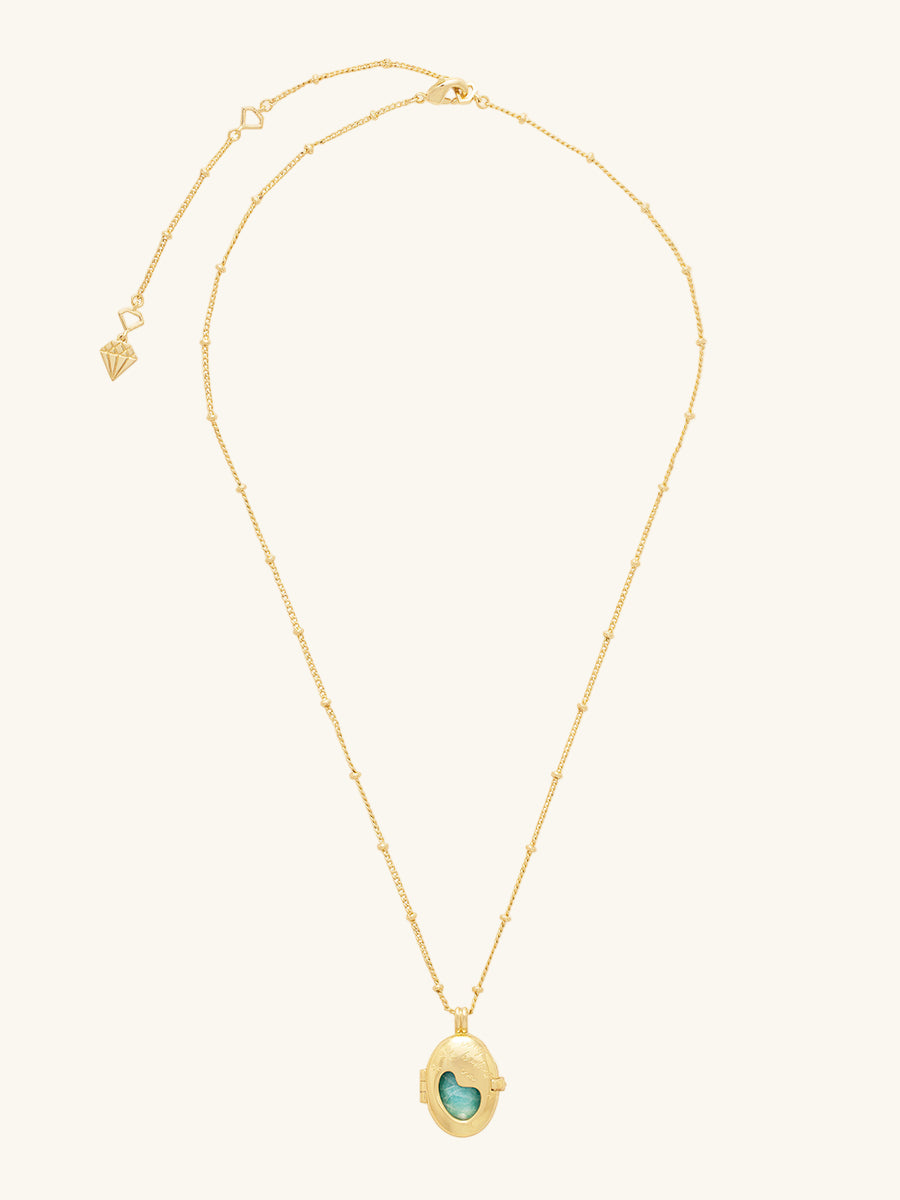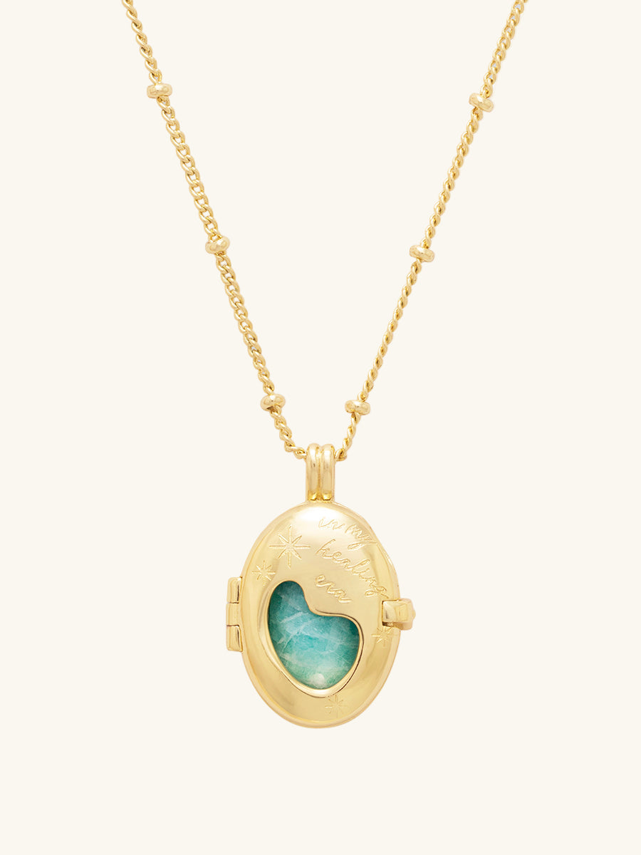 The Healing Amazonite Gold Locket Necklace is a keepsake locket piece, featuring the words ‘in my healing era’ etched upon it, a gentle reminder to ourselves to heal, learn and grow as we journey through life’s different chapters. Open the necklace to store your gemstone of the day, keeping it close to your heart. Start your collection with Amazonite which radiates soothing energy and connection to luck and prosperity.