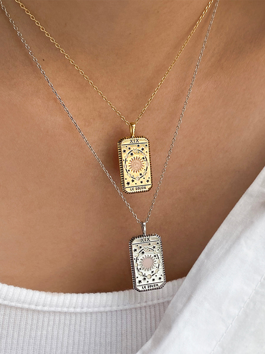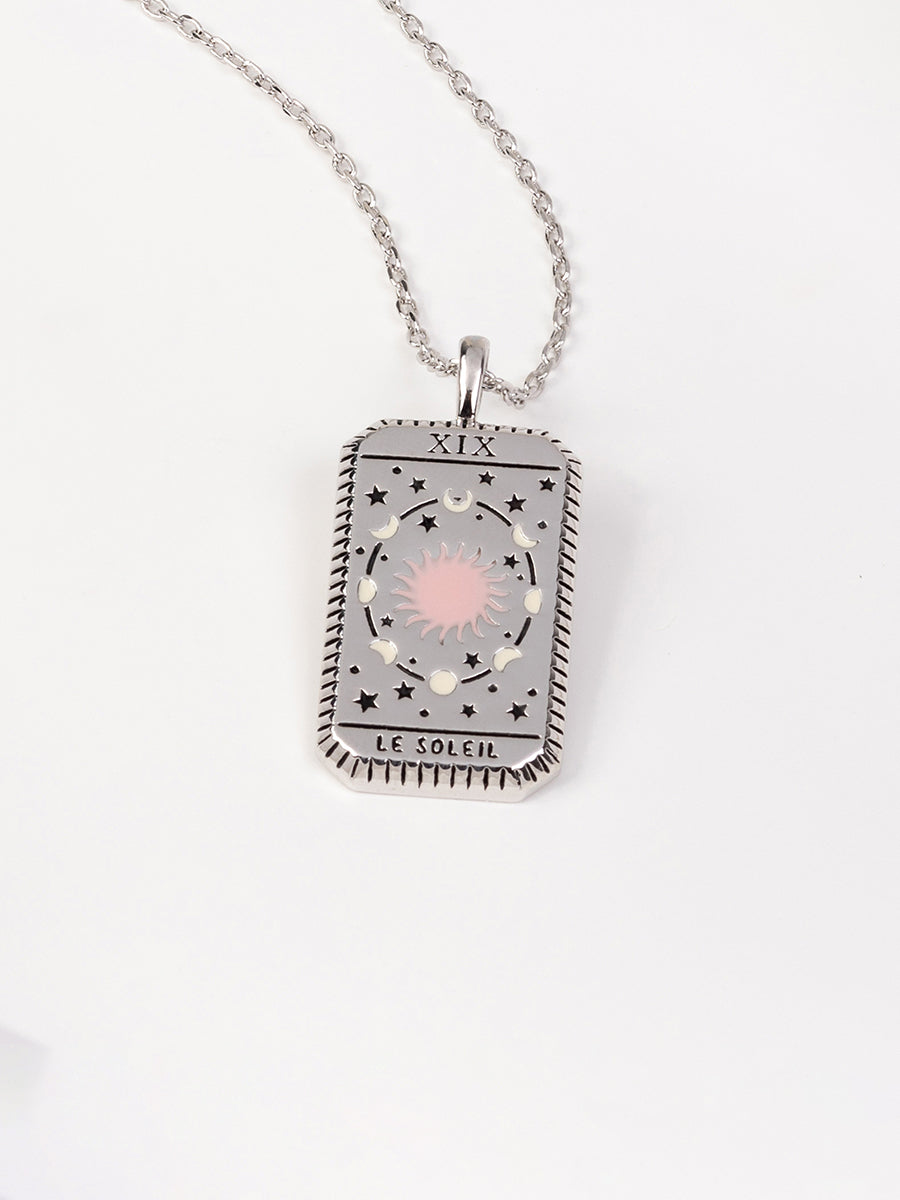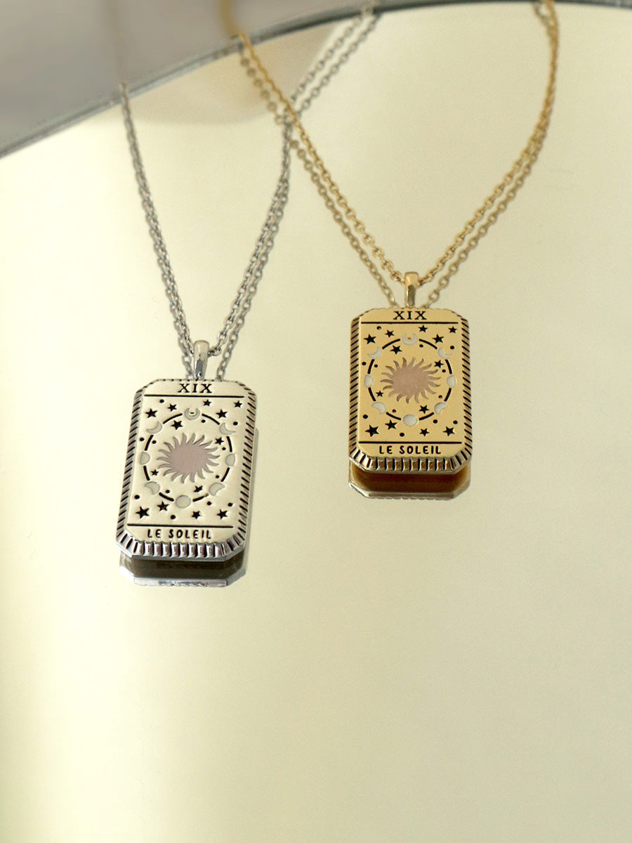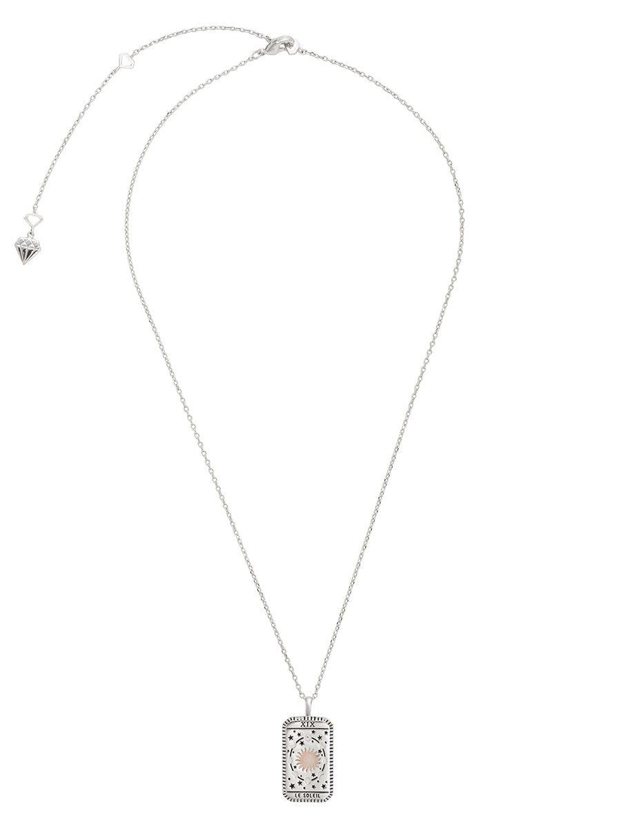 The Le Soleil Necklace is inspired by joy, optimism, happiness and harmony. The sun motif is hand painted with pink pearlescent enamel, representing good energy, whereas the moonphase in white enamel, symbolises that all things will come full circle, with a beginning and an end. The surrounding star motifs illustrate hope and better times ahead. Wear this piece as an affirmation of positive circumstances, radiating confidence of self as the universe comes together.
