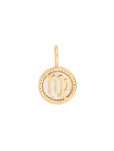 The Virgo Zodiac Mother of Pearl 14K Gold Vermeil Pendant features a slice of the iridescent mother-of-pearl, a natural luminescent material found in oyster shells. Its round pendant is traced with a twisted textured rope silhouette and features the Virgo zodiac symbol in a sleek and smooth finish.