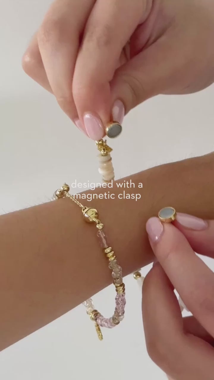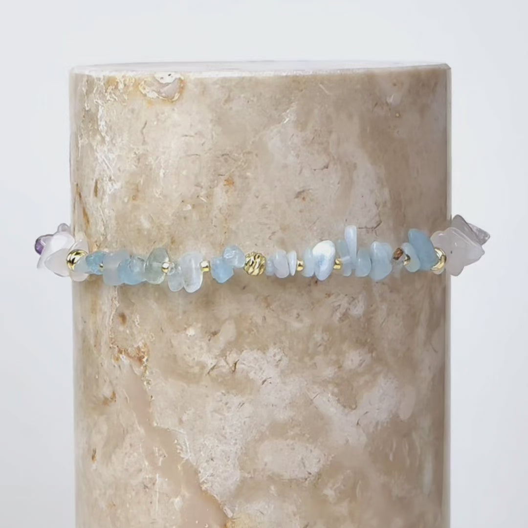 This bracelet features a harmonious blend of soft blue, white, and purple gemstone chips, accented with gold for a subtle shimmer. Inspired by the beauty of nature, its organic textures and delicate hues create a dreamy, ethereal feel. Designed with a convenient magnetic clasp, it ensures easy, fuss-free wear for your summer adventures. Lightweight and versatile, it’s perfect for layering or wearing solo, adding a touch of effortless elegance to any look,