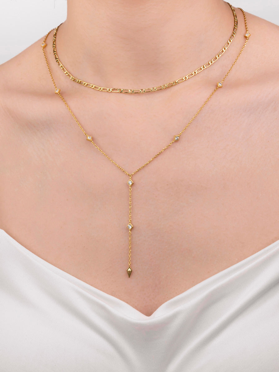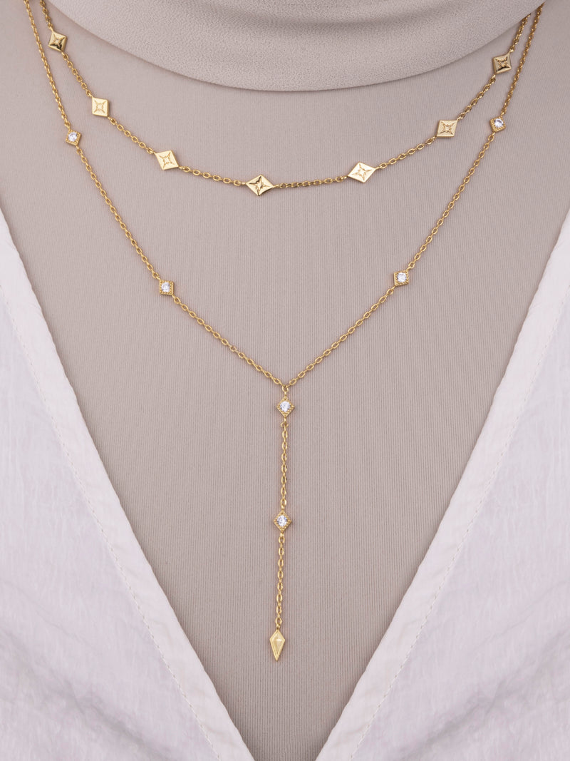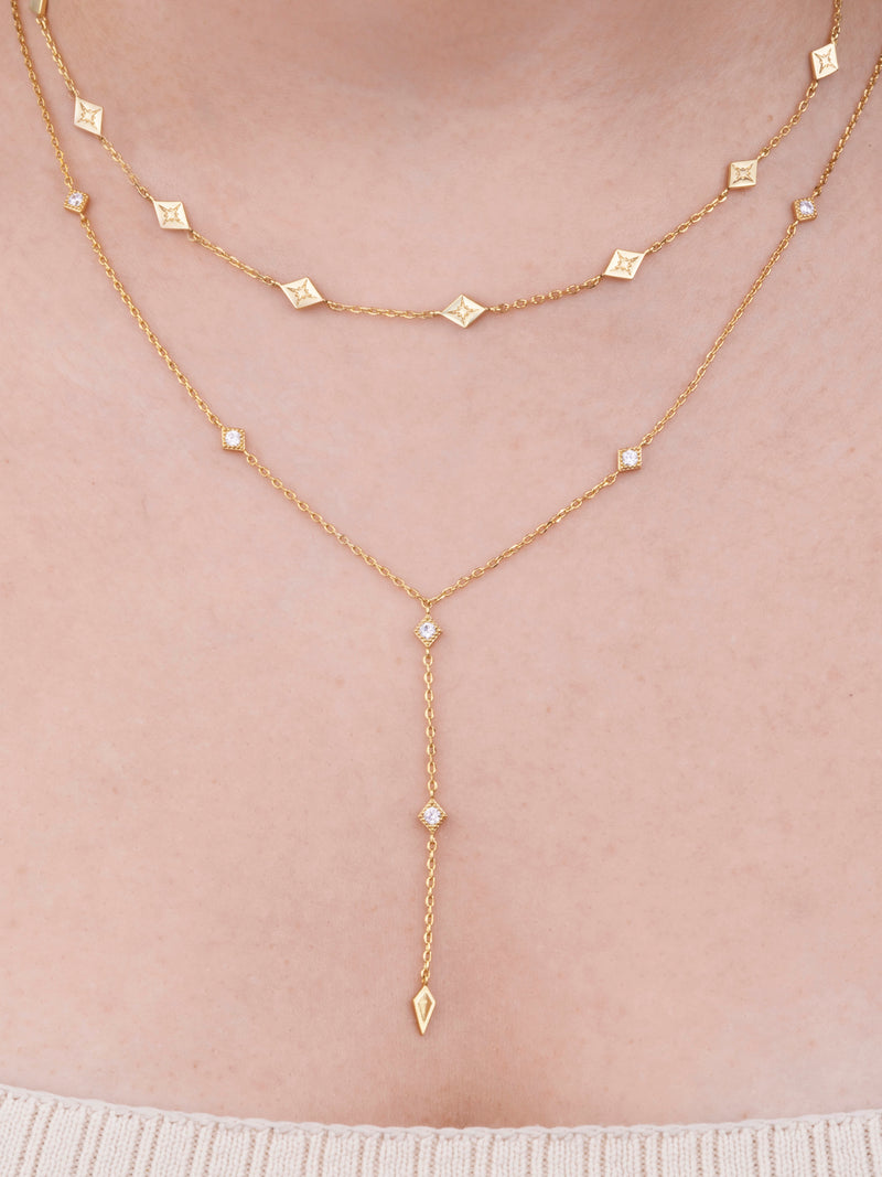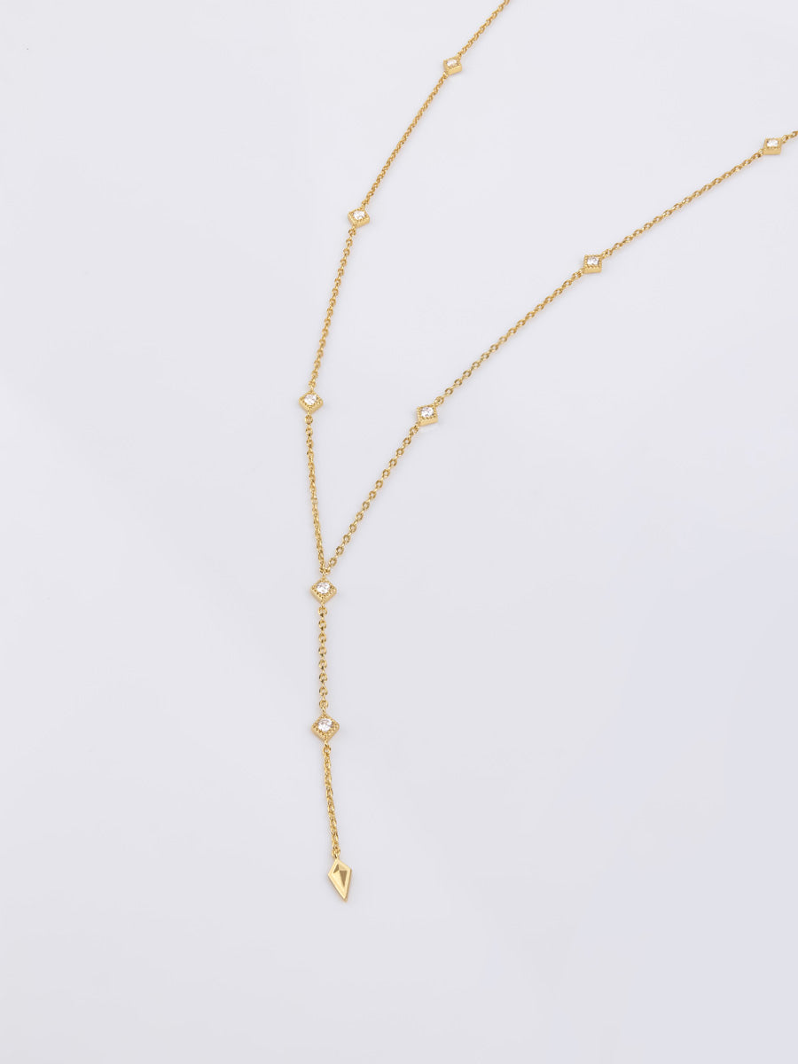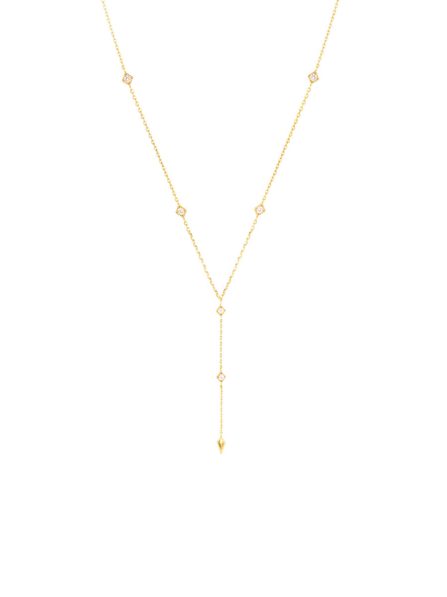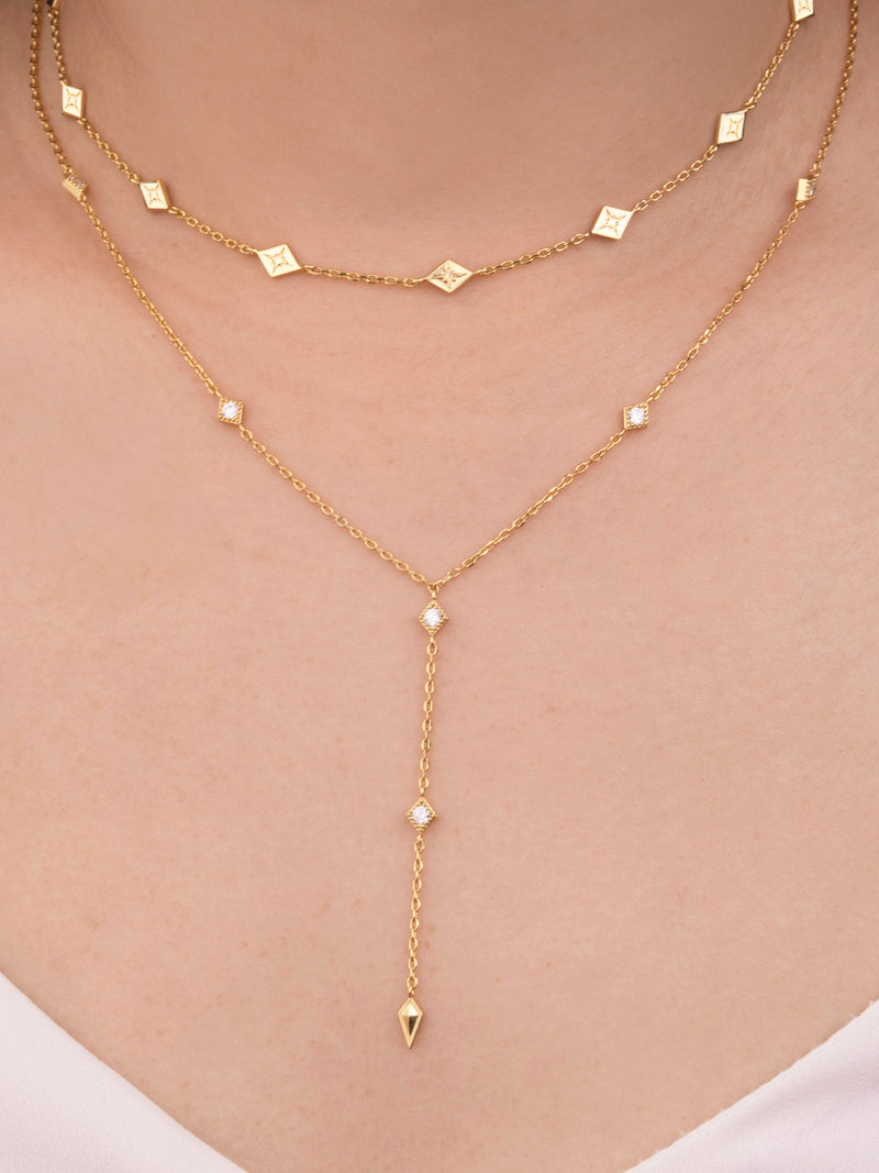 Delicate lariat piece that adds dimension to your everyday look. With dainty drops that sit on a classic chain, it’s a versatile style that effortlessly transitions from minimalist chic to evening elegance.