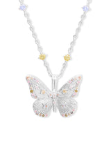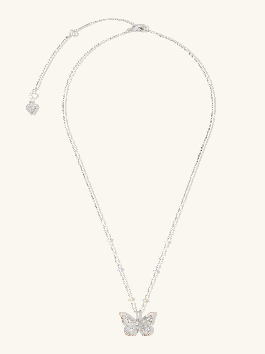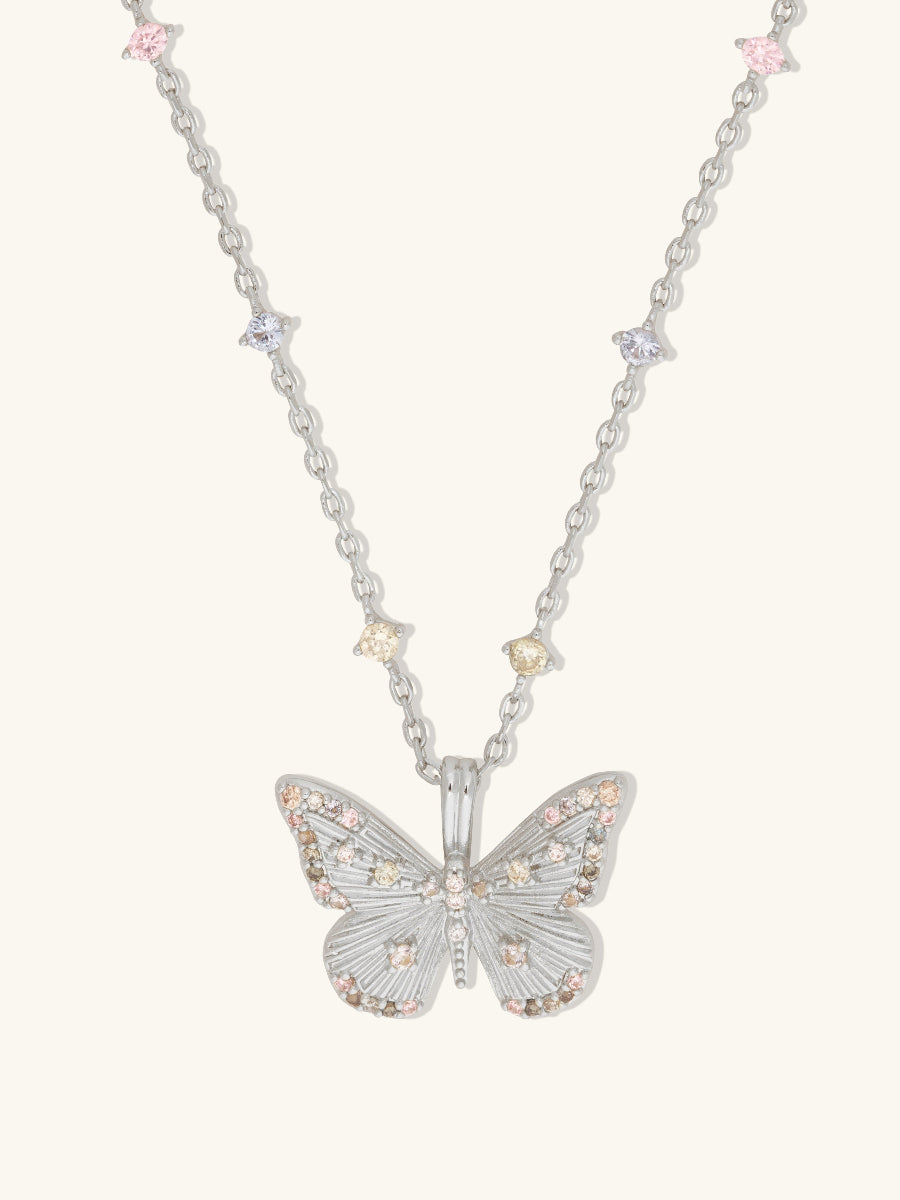 Inspired by our transformation through life’s different phases, the Butterfly Rainbow & Silver Necklace is the perfect symbol for hope and growth. The pendant is embedded with cubic zirconia gems in pastel shades of blush, blue and sage green, along the adjustable chain. Wear this silver plated statement piece on its own or layered for a flash of color.