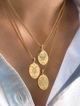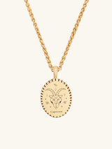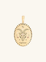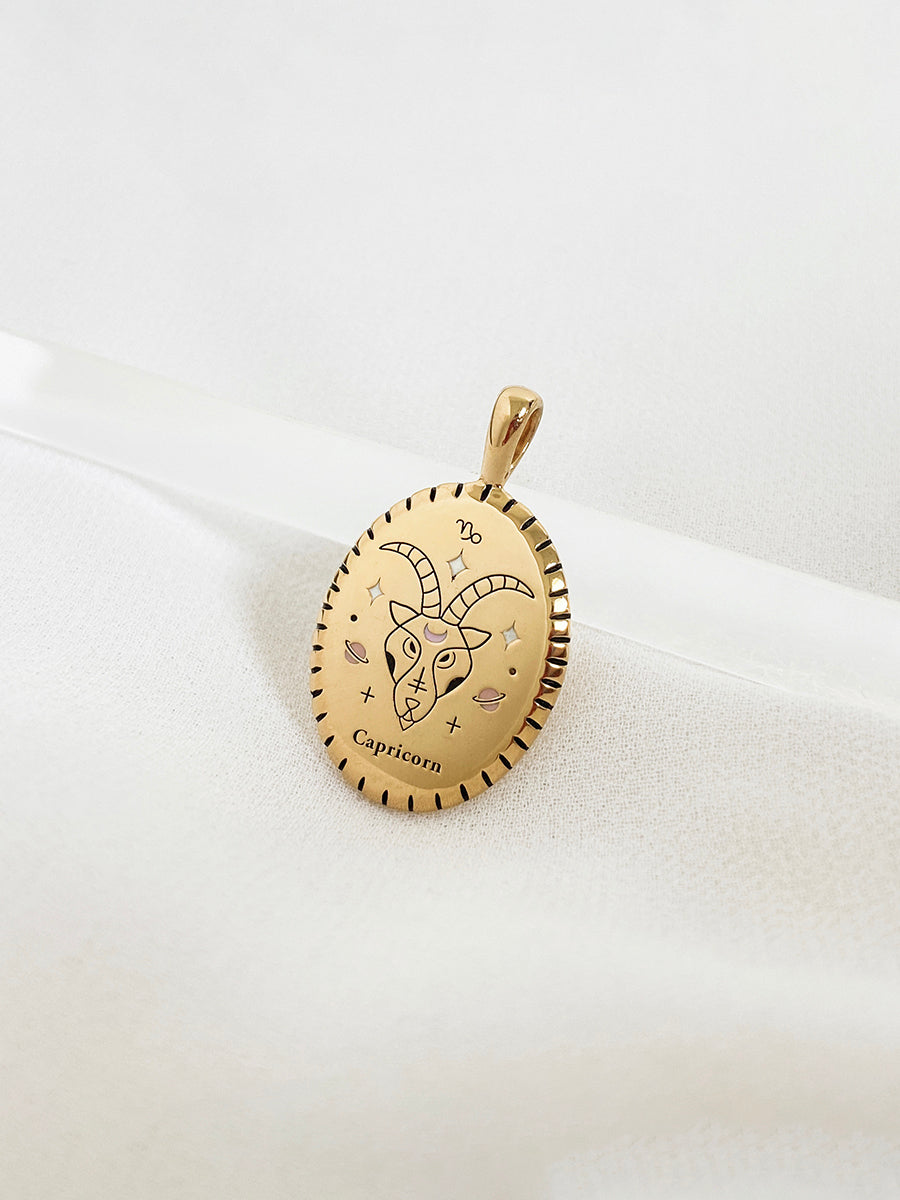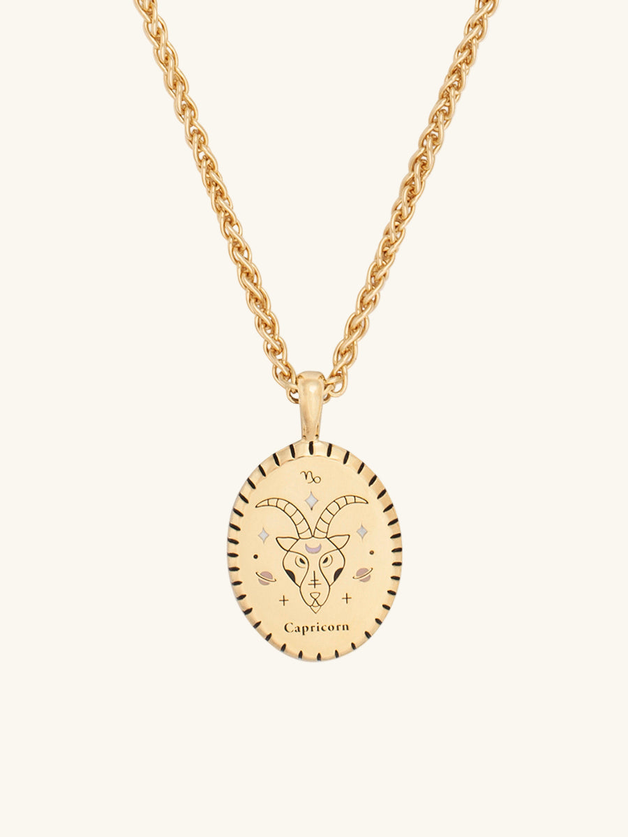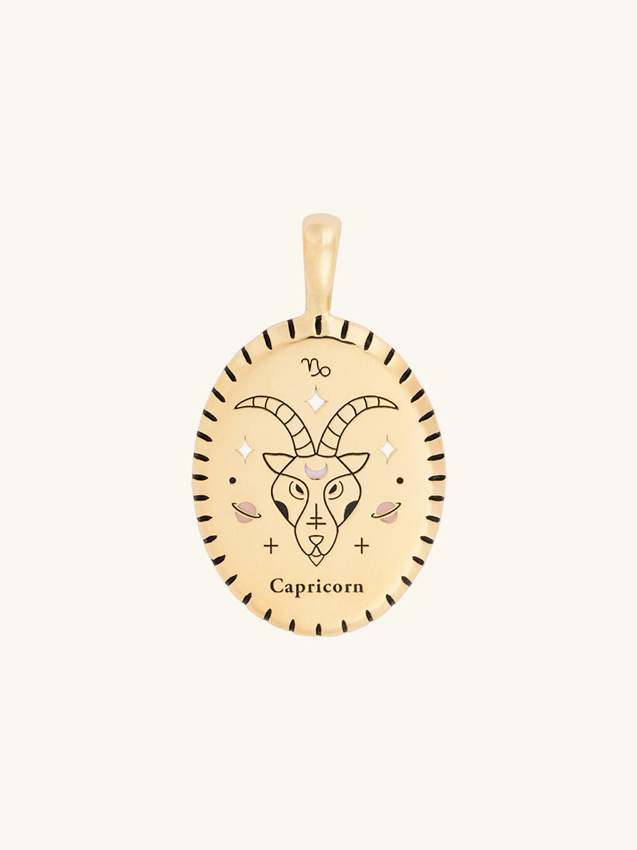 The hero pendant from the collection, the Capricorn Zodiac Enamel Pendant features a sleek 14K gold vermeil oval pendant, with intricate enamel detailing usually reserved for fine jewelry pieces. The Capricorn zodiac illustration is hand sketched and transposed onto the pendant design, and features its associated element. The hand-painted enamel colors on the Capricorn pendant are similar to Virgo and Taurus, symbolizing the earth element.