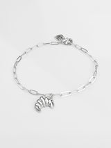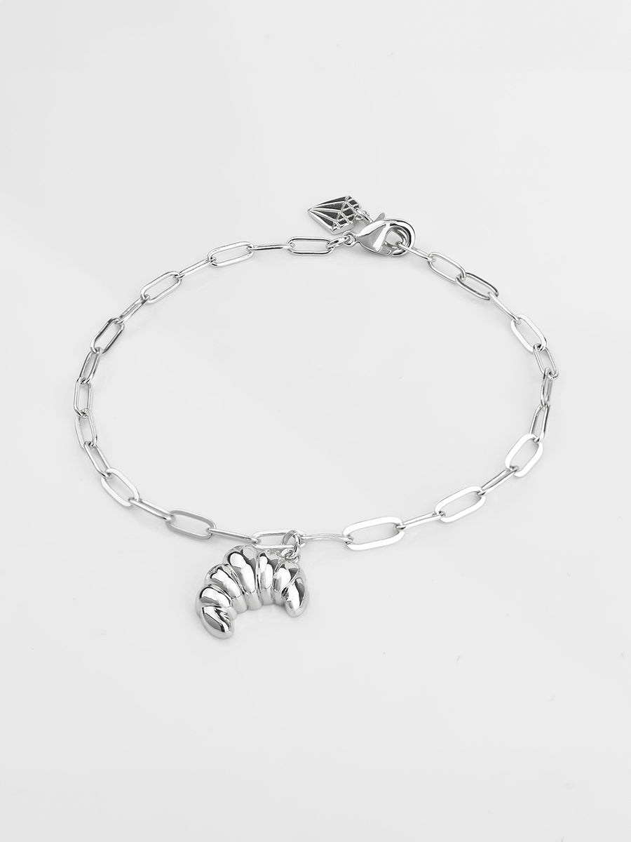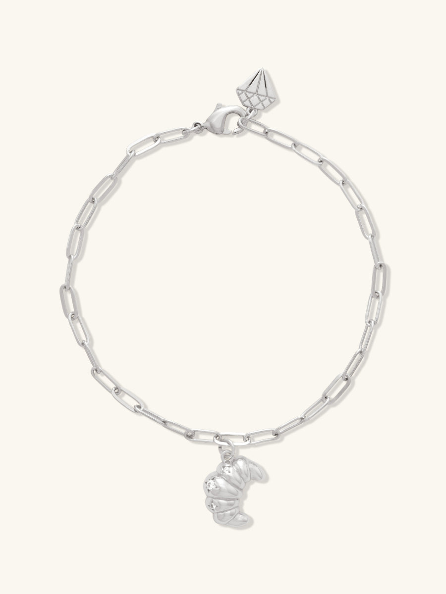 Crafted in sleek silver, the Croissant Silver Bracelet is a chic and whimsical piece inspired by the timeless elegance of French pastries. The necklace features a delicate silver-tone chain, with an intricately sculpted croissant charm that showcases fine detailing, mimicking the soft, layered texture of a freshly baked croissant. This necklace is perfect for effortless layering or a statement on its own, its vibrant yet refined aesthetic captures the essence of Parisian elegance.