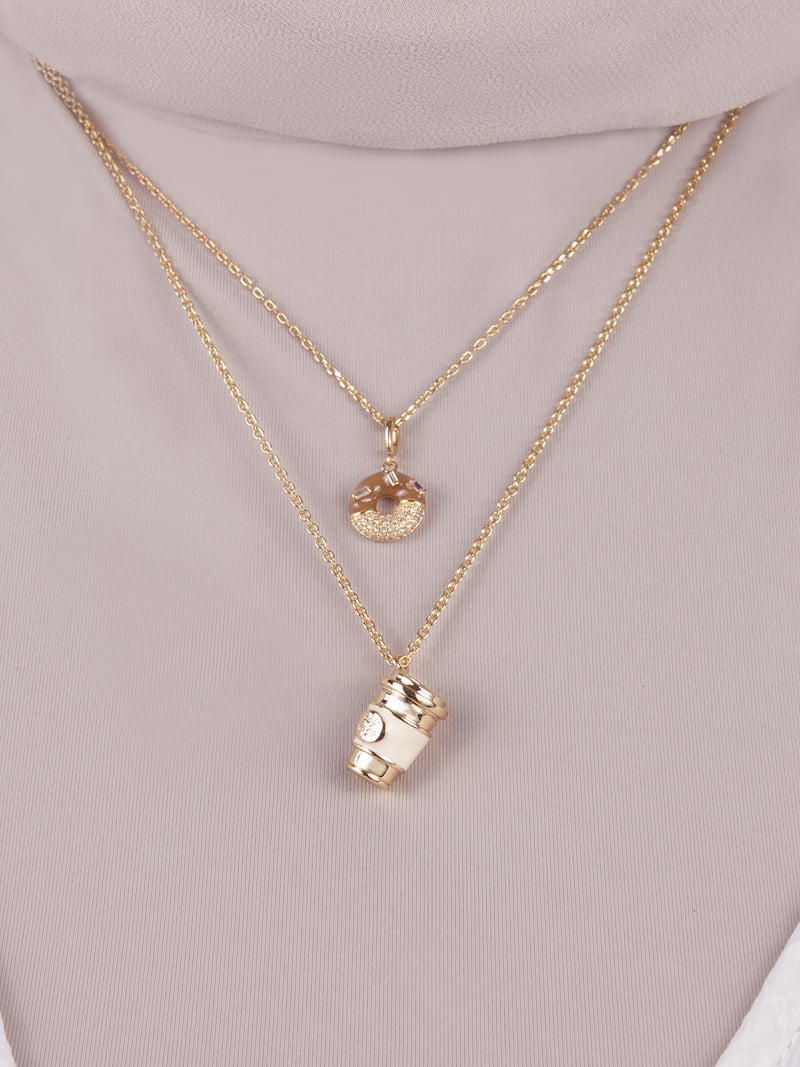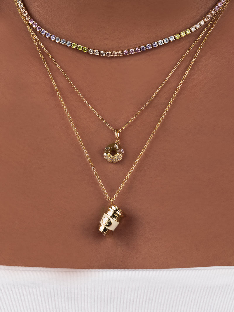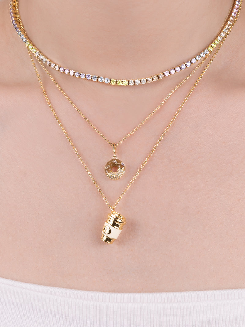 Inspired by the warmth of coffee culture, the Donut Coffee Glazed Gold Necklace combines smooth brown enamel with delicate 5A grade cubic zirconia details. Finished in gleaming 14K gold plating, the piece evokes comfort, indulgence, and effortless style. Designed for the modern muse, perfect for layering with everyday favorites or styling solo for a subtle statement