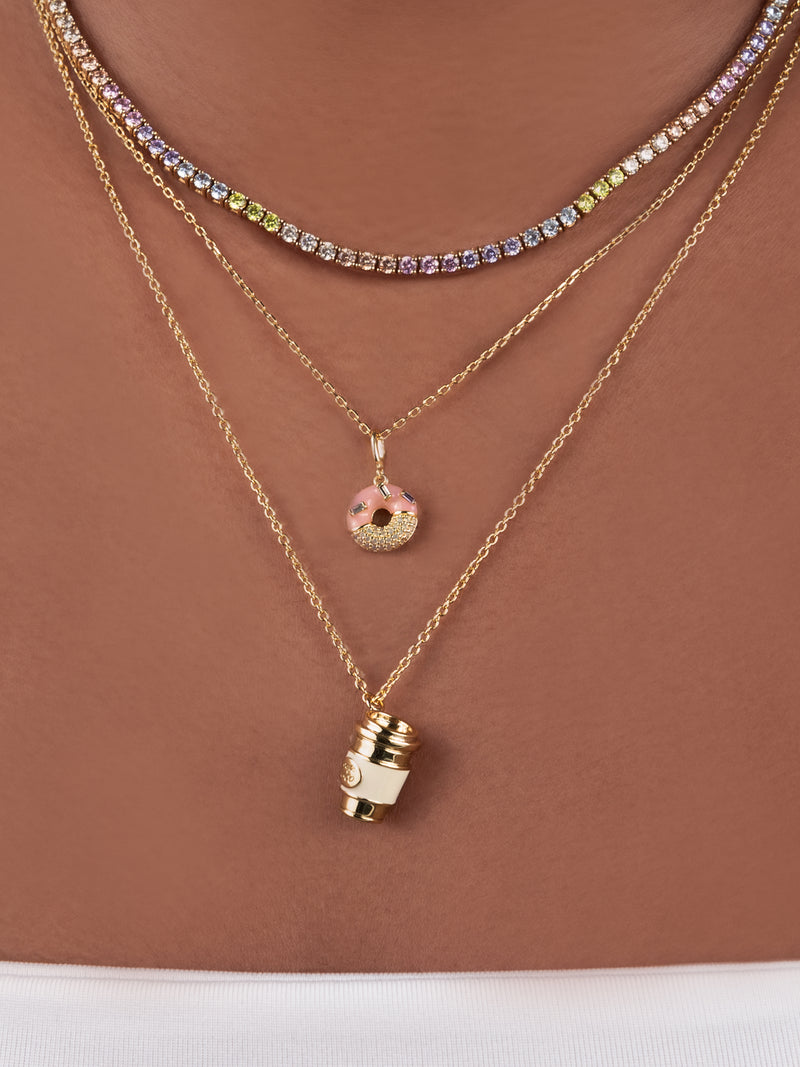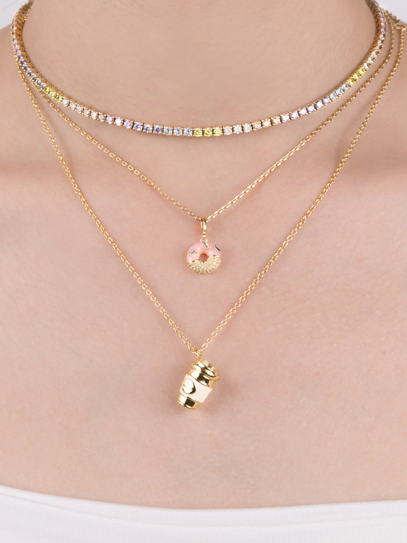 The Donut Strawberry Glazed Gold Necklace brings playful charm to your jewelry stack, featuring glossy pink enamel accented with sparkling 5A grade cubic zirconia gemstones. Crafted in gleaming 14K gold plating, this piece captures the sweetness of everyday moments while adding a touch of whimsy to your look. Designed to layer or shine on its own, it’s a whimsical reminder to savor life’s little joys.