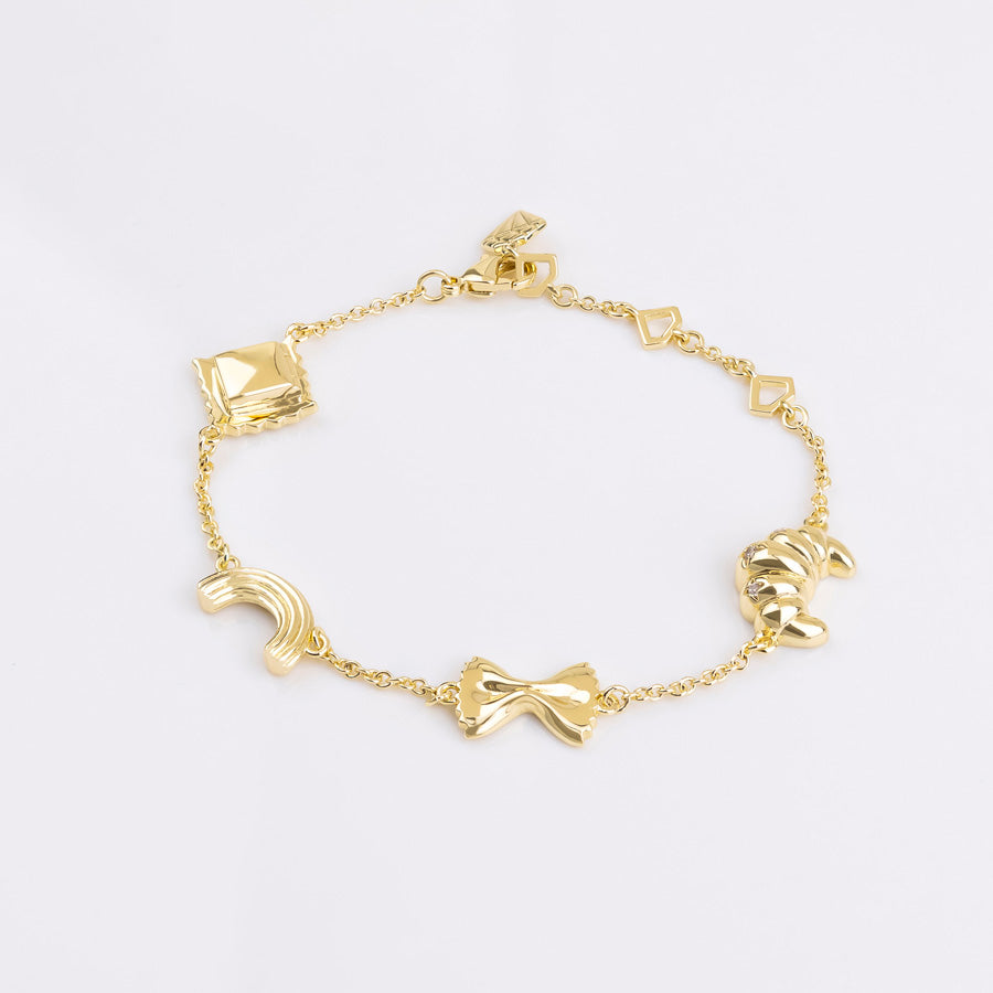 Crafted in radiant gold, the Food Party Charm Gold Bracelet features a playful array of miniature food-inspired charms, linked together on a delicate gold-tone and silver-tone chain. From a sculpted croissant to a delicately folded ravioli, each charm is crafted with intricate detail and polished to a high shine. Finished with a secure clasp for easy wear and a comfortable fit, this bracelet is a charming conversation starter — perfect for adding personality to your everyday stack.