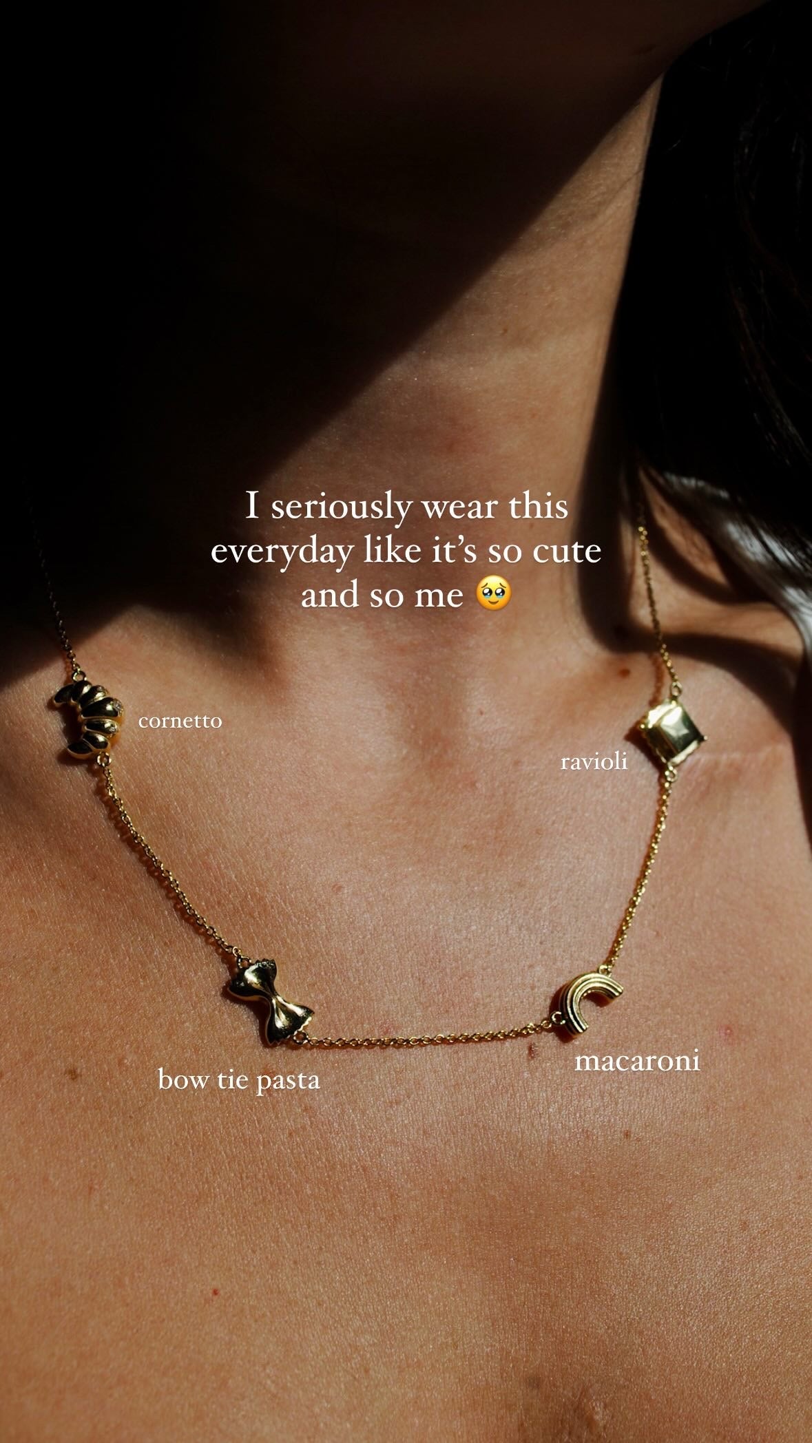 We’re craving our Food Party Charms Gold Necklace, a playful tribute to the simple joys of childhood and the carefree spirit of the 90s. Featuring a delightful mix of iconic food shapes – Bow Tie Pasta, Macaroni, Ravioli, and a Croissant – this necklace is a fun, nostalgic reminder of all the little things we loved growing up. Each charm is carefully crafted in a gleaming 14K champagne gold, giving these quirky designs an elegant touch. Whether you’re reminiscing about your favorite comfort foods or celebrating the colorful vibes of the past, this necklace is perfect for adding a pop of nostalgia to your everyday look.