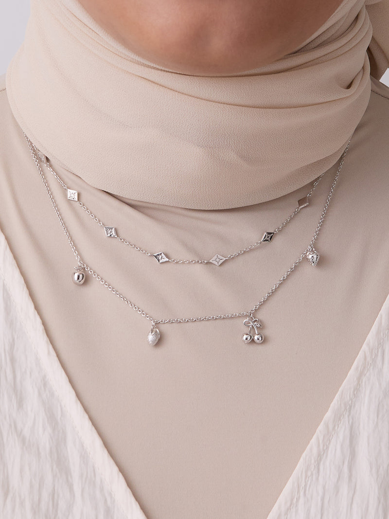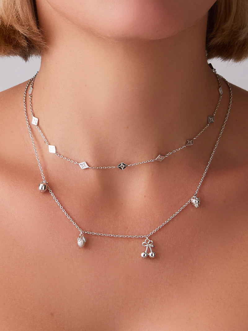 Crafted in sleek silver, the Fruit Party Charms Silver Necklace has a charming blend of playfulness and sophistication. Featuring adorable silver-plated fruit charms like cherries, lemons, and hearts, this delicate piece is both fun and elegant. Its dainty chain and whimsical details makes it the perfect accessory for everyday wear and special occasions.