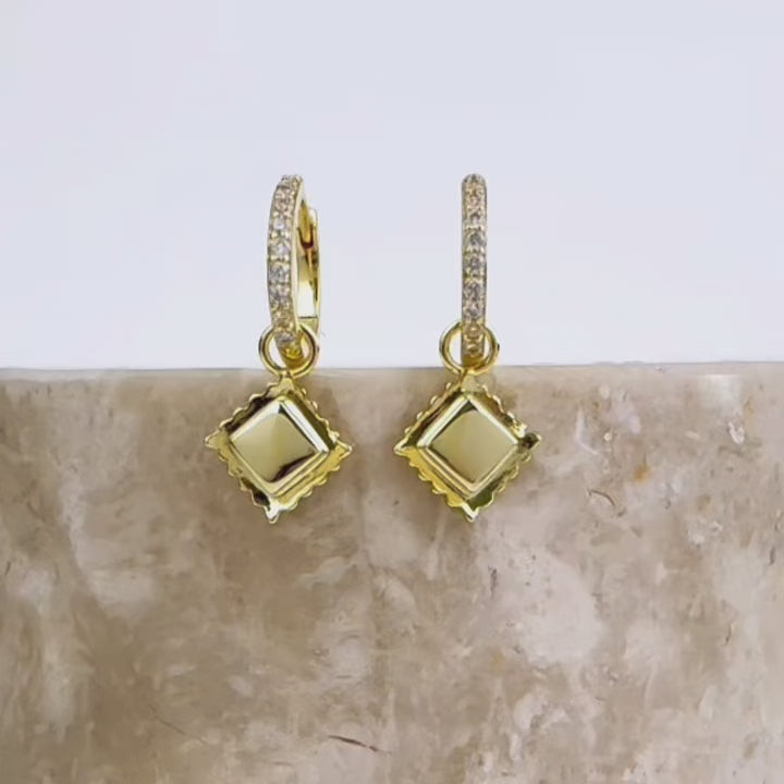 Designed with a luminous gold-tone finish and sparkling pavé stones, the Ravioli Charm Gold Huggie Earrings feature sleek, polished huggie hoops that ensure a secure and comfortable fit. Dangling below, the intricately crafted ravioli-shaped charms boast delicate scalloped edges, beautifully mimicking the texture of handmade pasta. Designed for all-day comfort, the lightweight hoops gently hug the ears with a secure hinge closure for easy wear.