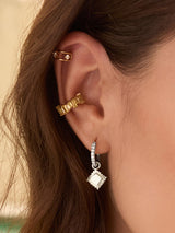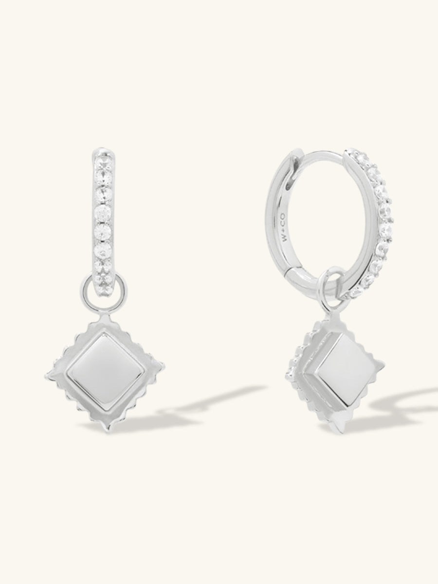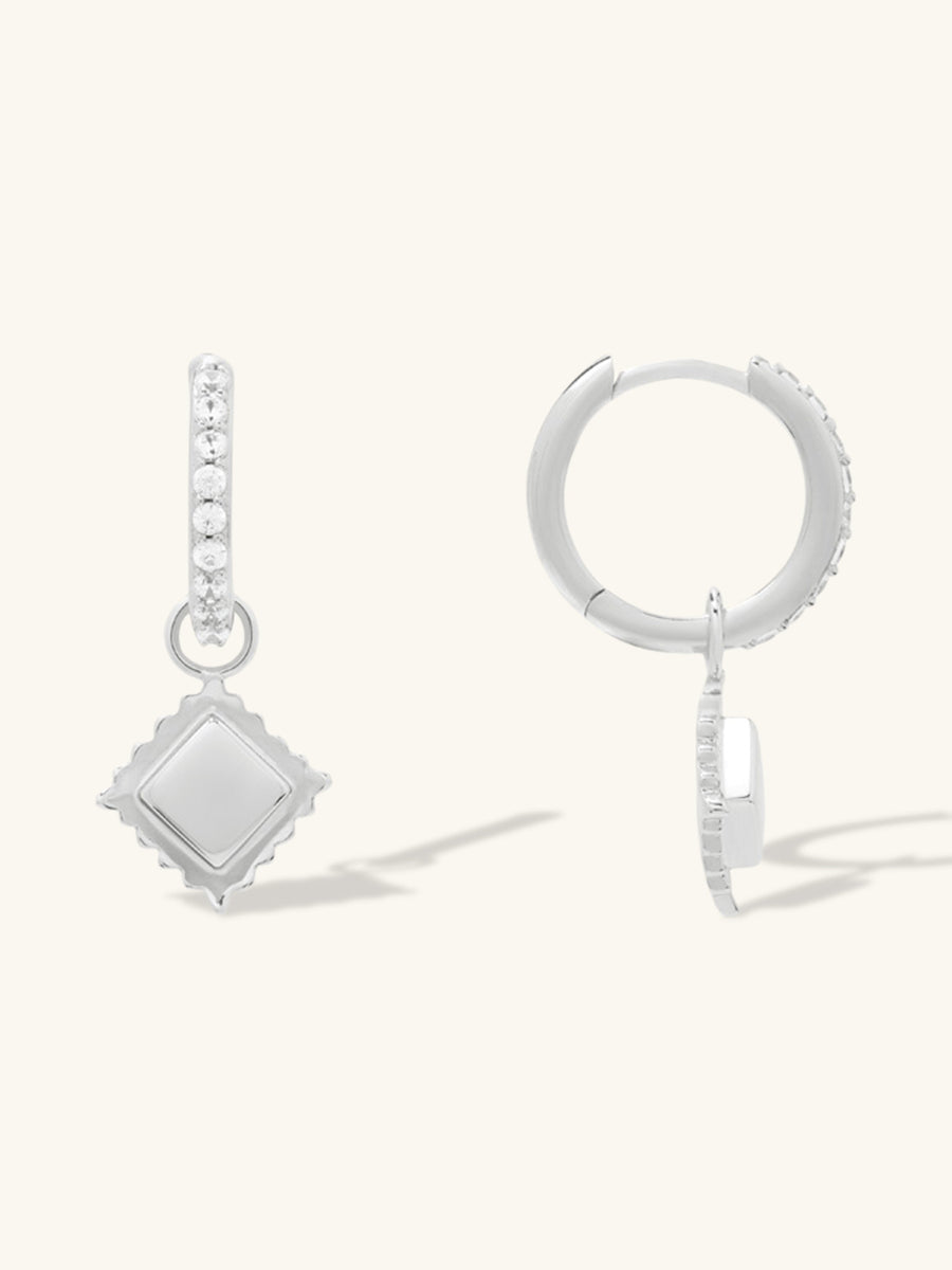 Designed with a luminous silver-tone finish and sparkling pavé stones, the Ravioli Charm Silver Huggie Earrings feature sleek, polished huggie hoops that ensure a secure and comfortable fit. Dangling below, the intricately crafted ravioli-shaped charms boast delicate scalloped edges, beautifully mimicking the texture of handmade pasta. Designed for all-day comfort, the lightweight hoops gently hug the ears with a secure hinge closure for easy wear.