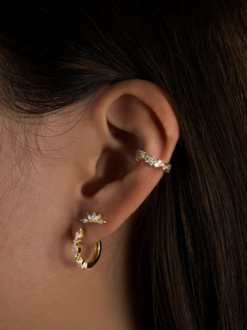 The Sunrays Gold Flat Back Earring features a cluster of clear 5A grade cubic zirconia gemstones arranged in a radiant sunburst design, inspired by the beauty and warmth of sunlight. This elegant piece adds a luminous sparkle to your curated ear, making it the perfect everyday statement. Designed with a flat back closure for a secure and comfortable fit from lobe to helix, it’s made to shine from day to night.