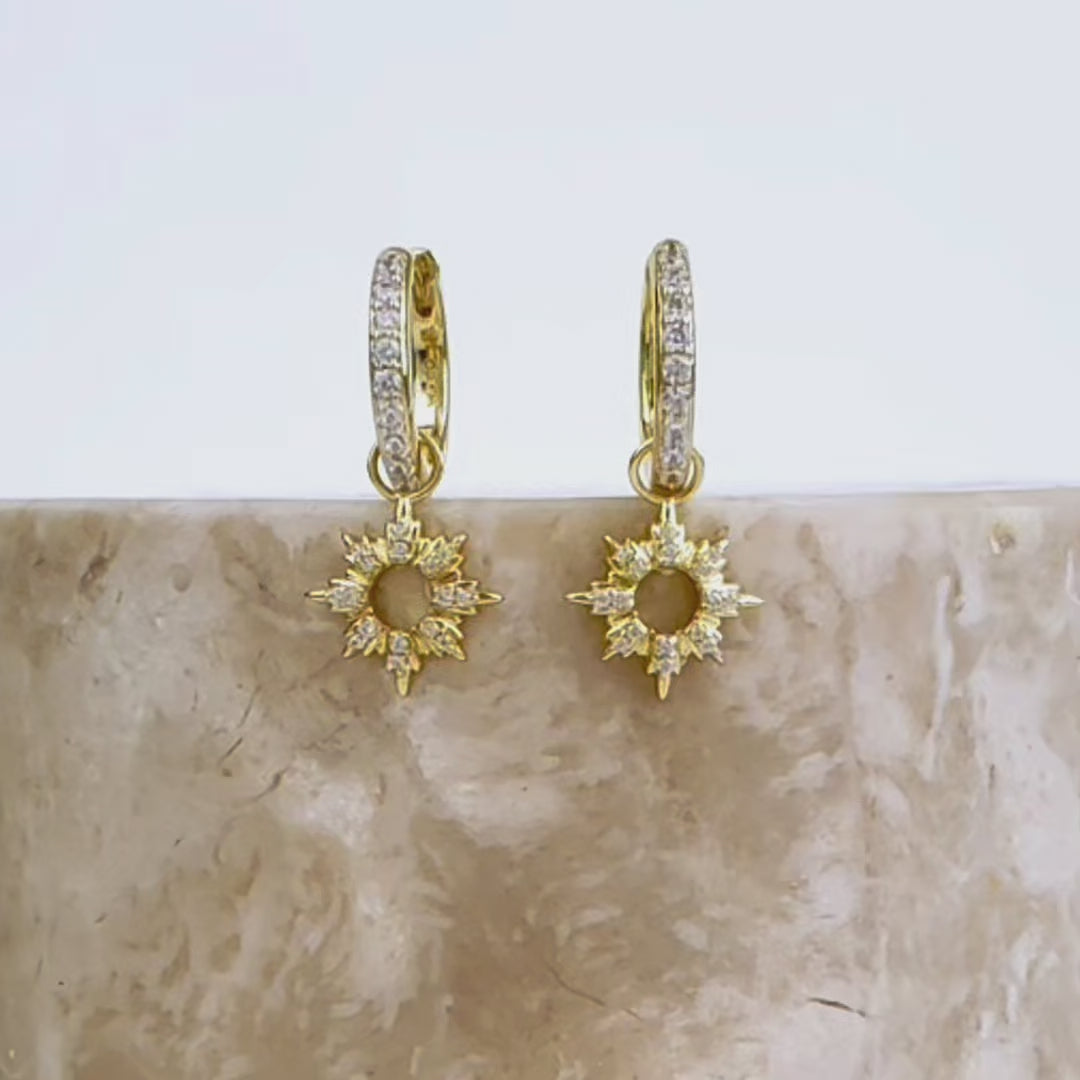 Featuring a radiant gold finish and sparkling pavé stones, these earrings feature a sleek huggie hoop adorned with shimmering pavé cubic zirconia for a subtle sparkle. Dangling below, the intricate sunburst charms add a celestial touch, symbolizing warmth and positivity. Designed for all-day comfort, the lightweight hoops gently hug the ears with a secure hinge closure for easy wear.