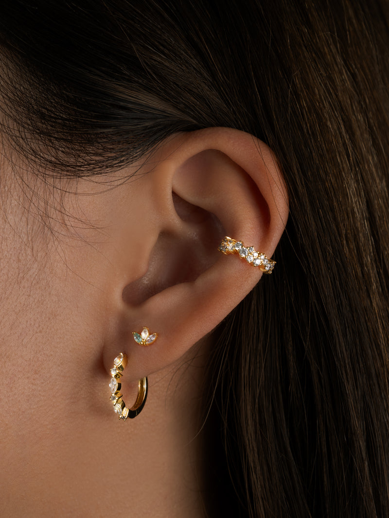 Elevate your ear game with the Trio Marquise Rainbow & Gold Flat Back Earring, a dainty yet dazzling piece designed to add a hint of color and sparkle to your curated ear. Featuring a trio of marquise-cut 5A grade cubic zirconia gemstones in rainbow hues, this elegant earring catches the light beautifully and complements any piercing, from lobe to helix.