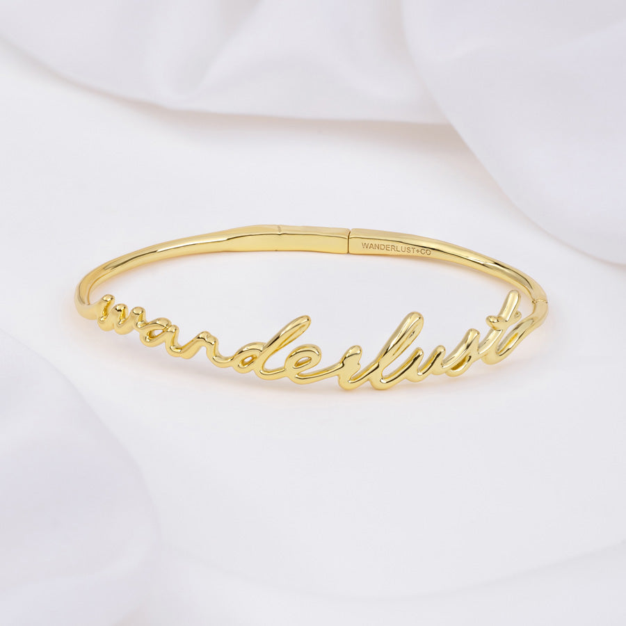 Elevate your wrist stack with our Wanderlust Gold Bangle. This sleek bangle features a cursive font detail of the word “wanderlust”, crafted with a hinged clasp and gleaming in champagne gold - sleek, versatile and perfect for everyday wear.