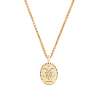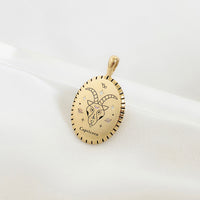 The hero pendant from the collection, the Capricorn Zodiac Enamel Pendant features a sleek 14K gold vermeil oval pendant, with intricate enamel detailing usually reserved for fine jewelry pieces. The Capricorn zodiac illustration is hand sketched and transposed onto the pendant design, and features its associated element. The hand-painted enamel colors on the Capricorn pendant are similar to Virgo and Taurus, symbolizing the earth element.